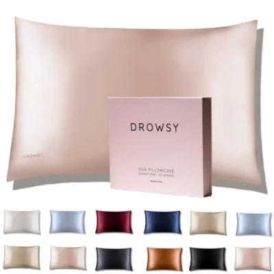Drowsy Silk Pillowcase 100% Pure Mulberry 22 Momme 6A High Grade Fibers Skin, Hair and Sleep Benefits Envelope Opening Queen/King Size (Sunset Pink)