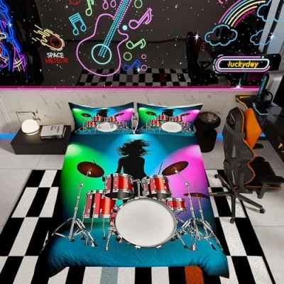 Drum Kit Bedding Set Rock Music Themed Duvet Cover For Kids Youth Teens Musical Pattern Comforter Young Man Bedspread Bedroom Decor Quilt 2Pcs Single Size