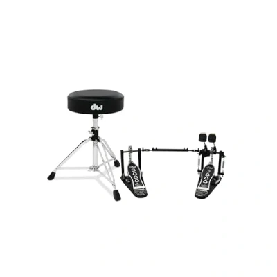 This 2-Piece Hardware Pack features a 3002A Double Pedal and 3100 Throne. For over 50 years, DW has been the worldwide leader in hardware innovation. Every DW product launch has been followed by tireless innovation, and the 3000 Series is no exception. This DW 3000 Series 2-Piece Hardware Pack features a 3002A Series Double Bass Drum Pedal and 3100 Round Top Throne. This 3002A Double Pedal features all-metal construction, dual-chain Accelerator cams, adjustable footboard angles, swivel toe clamp, and a steel base plate with anti-skid rubber mats.