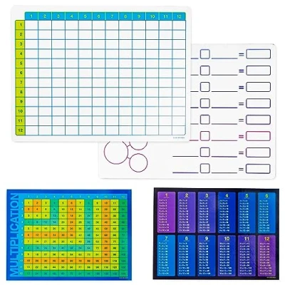 A CLASSROOM MUST-HAVE: Our 9x12" double-sided dry-erase multiplication practice board kit is perfect for students learning multiplication. One side features a standard, blank multiplication chart (up to 12 x 12) and the other side a set of fact family circles and blank multiplication sentences. CHART INCLUDED: Laminated, double-sided chart included. Features a color-coded multiplication table for quick reference on one side, and the other has facts organized by integer sets. Easy to read! SAFE AND DURABLE: Our board features rounded corners, safe for even the youngest mathematicians. Made of durable, solid materials that will stand up to classroom use year after year. EASY TO USE: Both sides of the board are compatible with dry-erase markers and can be easily wiped clean, making it a convenient tool for multiplication practice and review. VERSATILE: Great for classrooms of students in grade school or middle school. An essential tool for homeschool families.