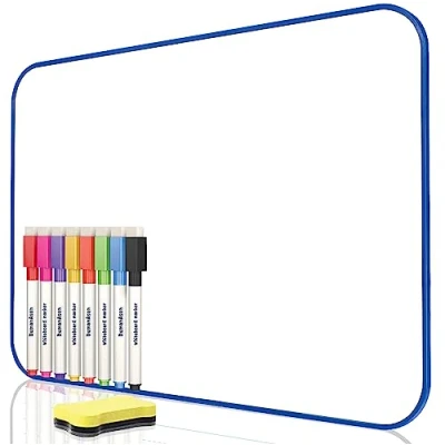 Package Includes:1 Double-Sided Dry erase Whiteboards and 8 Color Dry Erase pens with one Eraser whiteboard size: 12inch x 8inch. Double-Sided Magnetic Dry Erase Lapboard: whiteboard has a smooth surface that can be erased quickly and completely. It’s made by high quality environmentally materials. Magnetic Whiteboard a lightweight design allows the boards to be easily maneuvered. Multi-purpose Mini Magnetic Dry Erase Board: The small whiteboard can be used as drawing, writing, bulletin board, calendar notepad, etc., suitable for home, school, office, kitchen, study, etc. ABS Plastic Edges :The surface of the small white board is smooth. You can easily wipe all dry erase pens to prevent dust and ghosting. The frame is made of ABS plastic edges to prevent scratches. Double Sided White Board with Dry Erase Pens and Eraser for School, Home, Office, Remote Learning Smooth Writing & Easy to Clean: With its smooth and durable surface, our magnetic whiteboard provides a comfortable writing experience and effortless erasing, as you can simply wipe it clean with a cloth without leaving any traces.