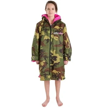 Dryrobe Advance The Original Long Sleeve Waterproof Changing Robe Oversized Coat with Fleece Lining for Beach, Cold Water Wild Swimming, Surfing Childs Age 10 13 Camo Pink