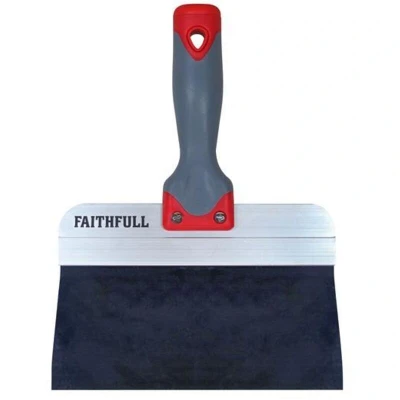 General description The Faithfull DWTAPE200 is a 200mm (8-inch) drywall taping knife designed for spreading jointing compound and applying drywall tape to cover joints in plasterboard. It is ideal for smoothing wall coverings, patching holes, and covering nail and screw indents. The knife features a flexible Blue Steel tapered blade and a soft grip handle with a thumb rest, providing comfort and precision during use. Technical specifications Blade width: 200mm (8 inches) Blade material: Blue Steel Handle: Soft grip with thumb rest Compatibility and accessories Compatible with jointing compounds Compatible with paper drywall tape Compatible with fibreglass drywall tape Suitable for use in drywall finishing and repair projects Installation No installation required. Usage Spread jointing compound over joints and screw/nail indents Apply drywall tape over joints and smooth out air bubbles and excess compound Use for patching holes and finishing wall surfaces