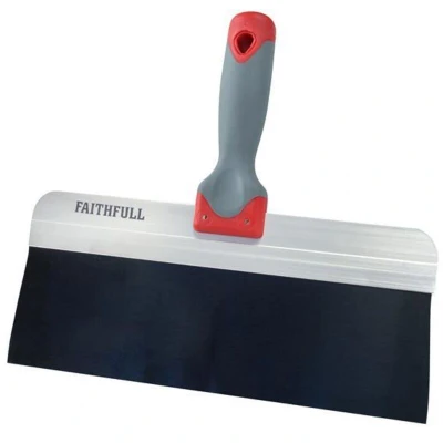 General description The Faithfull Drywall Taping Knife is a professional tool designed for spreading jointing compound and applying drywall tape to cover joints in plasterboard. It is ideal for smoothing wall surfaces, patching holes, and covering nail or screw indents. The knife features a flexible Blue Steel blade and a comfortable soft grip handle with a thumb rest, making it easy to work with, especially in corners. Technical specifications Blade width: 300mm (12 inches) Blade material: Blue Steel Handle: Soft grip with thumb rest Compatibility and accessories Compatible with jointing compounds Compatible with drywall tapes Compatible with wall patching materials Available in two widths: 200mm and 300mm Installation No installation required; ready to use out of the box Usage Spread jointing compound over drywall joints Apply paper or fiberglass drywall tape Use for patching holes and smoothing wall surfaces Other information Designed for professional and DIY drywall finishing