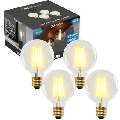 DSLebeen E27 LED Light Bulbs 6W (60W Incandescent Equivalent) G80 Edison Screw Bulb 800lm Decorative Vintage Filament Lighting Clear Globe Glass CRI 90+ Warm White 2700K Non Dimmable 4 Pack
