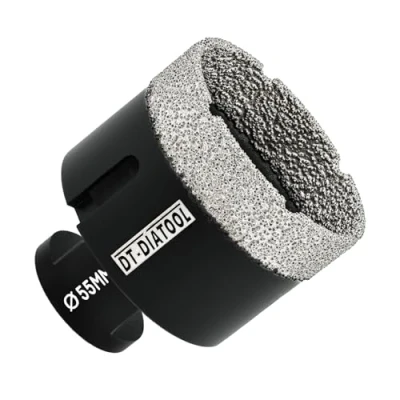 1 piece 55mm dry diamond drill core bit Diameter: 55mm; Diamond Height: 15mm; Total Length: 62mm; Grit:#40/50; M14 Thread for Angle Grinder Dry drilling for tile porcelain ceramic granite marble stone High diamond exposure rate provides a faster and more aggressive drilling Vacuum brazed technology provide much longer life than electroplated ones, Manufacturer: DT-DIATOOL