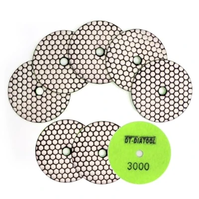 Resin bond diamond flexible dry polishing pads; Material: Industrial diamond grain; Resin; Nylon buckle Quantity: 8 Pieces; Diameter: 4"/100mm; Grit: #3000; Workable Thickness: 1.5mm Flexible, suitable for different shape polishing granite marble ceramic stone Dry polishing; Working WITHOUT water (Very important); convenient and less pollution Recommended speed is 2500RPM; Max capacity is 4000RPM