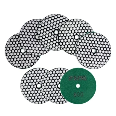 Resin bond diamond flexible dry polishing pads; Material: Industrial diamond grain; Resin; Nylon buckle Quantity: 8 Pieces; Diameter: 4"/100mm; Grit: #800; Workable Thickness: 1.5mm Flexible, suitable for different shape polishing granite marble ceramic stone Dry polishing; Working WITHOUT water (Very important); convenient and less pollution Recommended speed is 2500RPM; Max capacity is 4000RPM