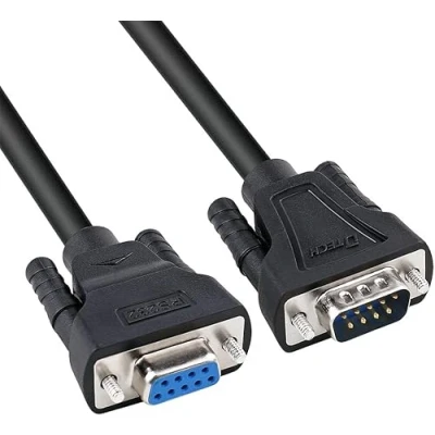 Simple 15ft null modem extension cable (3 wire type and no hardware handshaking) extends a COM port connection between computer and some old device with RS-232 compatible Wired as a 9 pin serial cable male to female port cord that 2-3 line are crosslinked (only TX/RX data and signal ground wires connected); standard shielded with AL foil DB9 m/f adapter extender equipped with screws on each end to ensure an easy and solid connection for stable data communication The wires inside are of 30AWG gauge and easy to solder to, and they connect to the pins in the order of the standard wire color code 15 feet long RS232C cable for hooking up RS232C equipment like scanner, Modem, printer, plotter, camera, barcode / embroidery machine, touchscreen, microcontroller, factory test equipment