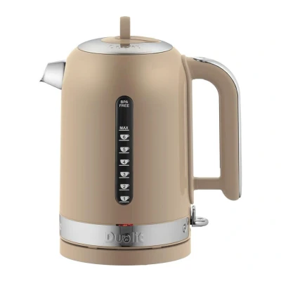 The Dualit Classic Kettle Full Sandstone Body with Brushed Panels is the quietest kettle that Dualit have designed. It has been awarded the Quiet Mark - the international mark of approval from the Noise Abatement Society. So you can be assured that the Dualit Classic Kettle is one of the quietest you can buy.Patented Repairable Element - the Dualit Classic Kettle is truly built to last. Fitted with a revolutionary patented replaceable element, the lifetime of your kettle is greatly extended.Dual Windows - the Dualit Classic Kettle is cleverly designed with two different measuring windows. For avid tea drinkers, one side features a cup level indicator and the other side measures the water in litres.Patented Whisper Boil™ function - the Classic Kettle is the quietest kettle that Dualit have designed. It has been awarded the Quiet Mark - the international mark of approval from the Noise Abatement Society.Average Classic Kettle boiling times: 1 Cup (250ml) : 00:48, 2 Cup (500ml) : 01:22, 4 Cup (1000ml) : 02:14, 6 Cups (1500ml) : 03:30, 1.7L Max (1700ml) : 03:50.Ergonomic silicon grip handle. High quality stainless steel with a silicon grip for comfort.The precision engineered non-drip spout prevents water dripping onto your kettle or work surface.Durable hinged lid for our trademark longevity and reliability, with heatproof ring and finger guard.Patented anti wobble feet for increased stability on work surfaces while boiling.Integral cord storage to keep your work surface tidy.Removable, washable limescale filter.Cordless operation with 360° swivel base.Boil-dry safety cut-off.Superfast 3KW element.Designed and engineered in the UK.Dimensions: Width: 15.4cm, Depth: 23.5cm, Height: 28.08.Capacity: 1.7 litres.