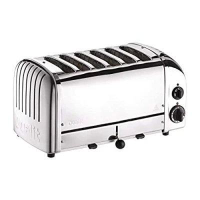 Accomodates up to 4.75" x 5.5" slices Push down lever to eject Pull-out crumb tray Simple twist timer to set for desired browning of toast Selector switch for number of slots needed