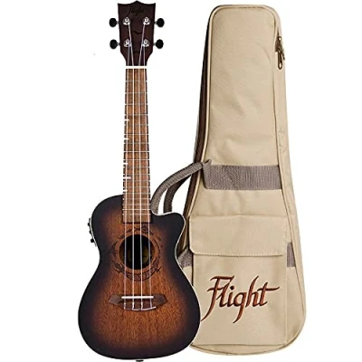 The Flight DUC380 CEQ Concert Ukulele is made from laminate mahogany which gives a solid and punchy tone. Okoume Neck & Walnut Fingerboard Stylish Cutaway Equipped with Flight FU-T3 pickup Carefully-designed headstock fitted with geared tuners that will always stay in tune. Includes padded gigbag and Instruction Booklet