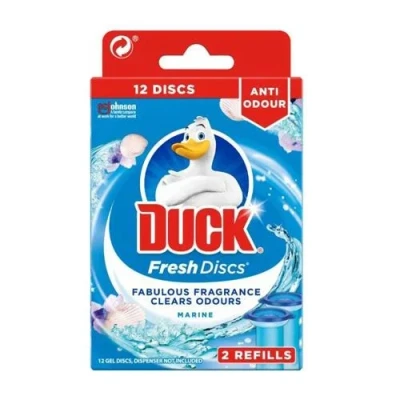 Enjoy the long-lasting freshness of Toilet Duck Fresh Discs in a Marine scent with our affordable Refill pack. Easy to apply, the gel discs sit just below the toilet rim for a hygienic alternative to traditional rim blocks.. Toilet Duck fresh discs release toilet cleaning ingredients with each flush to clean the bowl and prevent limescale and germ build-up. The Marine scent is the perfect scent to freshen any bathroom.. Each pack contains 2 refill dispensers, which contain 12 discs full of fresh marine scented gel.. 72ml Toilet Duck Marine refill pack. Lasts up to 16 weeks. Fights limescale build-up. Anti-odour. 12 gel discs. Dispenser not included