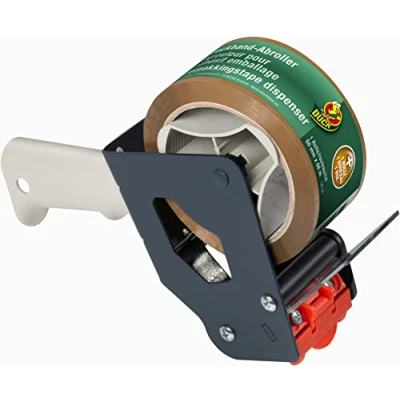 The Duck packing tape set is used for handy packaging of household packages and gifts Unrolling is effortless and the tape is very easy to tear off thanks to the sharp blade - particularly useful for effective and fast packaging No annoying searching: Thanks to the integrated dispenser, the open end of the packaging tape is always ready to use and can be used anytime and anywhere The sturdy hand dispenser can be used for packing tapes up to 50 mm wide Box contents: 1x Duck hand dispenser and 1x brown packing tape, 50 mm x 60 m