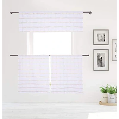 Bring a fresh, fashionable and elegant look to any room with this small kitchen window curtain featuring a fresh stunning Stripe design. They will provide you the necessary privacy and allow just the right amount of light into any room. Each curtain made of jacquard fabric. Perfect for a kitchen, laundry room or guest bathroom. Measures 58x15" (1 Piece) 29x36" (2 Pieces) Included: (1) Valance & (2) Tiers 100% Cotton Bring elegance to your home with these fashionable Stripe Kitchen Curtain & Tier Set that will add a touch of elegance at the same time being practical. Provides privacy and filters light.