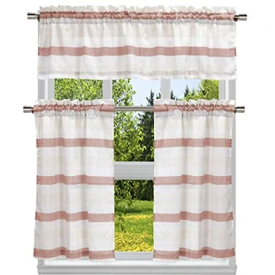 Bring a fresh, fashionable and elegant look to any room with this small kitchen window curtain featuring a fresh stunning Stripe design. They will provide you the necessary privacy and allow just the right amount of light into any room. Each curtain made of jacquard fabric. Perfect for a kitchen, laundry room or guest bathroom. Included: (1) Valance & (2) Tiers Polyester Bring elegance to your home with these fashionable Window sheer tiers that will add a touch of elegance at the same time being practical. Provides privacy and filters light. Machine washable in cold water, use only non-chlorine bleach when needed, tumble dry low and warm iron as needed