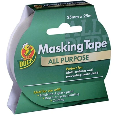 General description Shurtape Duck Tape® All-Purpose Masking Tape is designed for general interior applications, effectively preventing paint bleed during painting projects. Technical specifications Width: 25mm Length: 25m Clean removal for up to 30 hours Usage Suitable for use with most paints, including emulsion, gloss, and spray paint Compatible with most varnishes