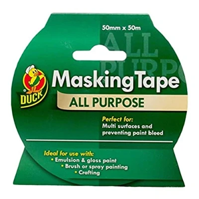 General description Shurtape Duck Tape® All-Purpose Masking Tape is designed for general interior applications, effectively preventing paint bleed during painting projects. Technical specifications Dimensions: 50mm x 50m Clean removal for up to 30 hours Usage Suitable for use with most paints, including emulsion, gloss, and spray paint Compatible with most varnishes