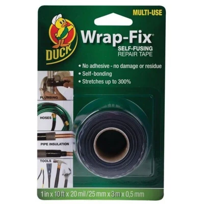 General description Shurtape Duck Tape® Wrap-Fix® Self-Fusing Repair Tape is designed to provide a watertight seal without the use of adhesives, ensuring no damage or residue is left behind. This versatile tape is self-bonding and can stretch up to 300%, making it ideal for a variety of applications including plumbing, automotive, marine, and general-purpose repairs. Technical specifications Colour: Black Width: 25mm Length: 3m