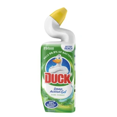 Experience a sparkling clean and fresh toilet with Duck Deep Action Gel Pine Forest! Its deep cleaning formula eliminates 99.9% of germs, while removing limescale and tough toilet stains. The uniquely shaped neck reaches under the rim for a thorough clean. Say goodbye to harsh smells and hello to a fabulous pine scent!. 1 x Duck Deep Action Gel Pine Forest 750ml. 50% recycled plastic. Kills 99.9% of bacteria