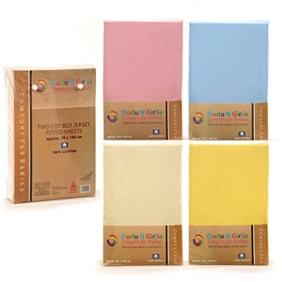 Dudu N Girlie Cot Bed Sheets 140 x 70 Fitted Jersey Cotton Hypoallergenic Bedding Fully Elasticated Skirt Breathable Easy Care (Pack of 2, Blue & Yellow)