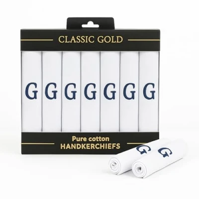 Dudu n girlie 7 piece pure cotton initial monogrammed men's handkerchiefs hanky gift box set Size: 16 inches x 16 inches/ 40 cm x 40 cm 100% pure cotton, excellent quality Care guide: machine washable, tumble dry