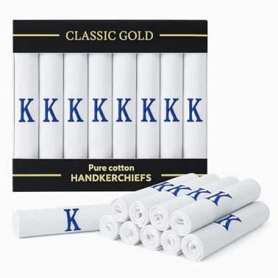 DUDU N GIRLIE Mens/Gentlemens White Satin Bordered Handkerchiefs with & Blue Embroidered Initials, K, One Size