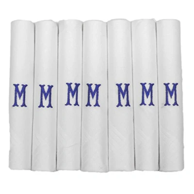 Dudu n girlie 7 piece pure cotton initial monogrammed men's handkerchiefs hanky gift box set Size: 16 inches x 16 inches/ 40 cm x 40 cm 100% pure cotton, excellent quality Care guide: machine washable, tumble dry