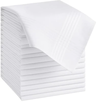 Quality - perfect finishing. Crafted with 100% premium cotton and precision stitching technology, Men’s handkerchiefs made of high-quality cotton, better quality than normal cotton, with strong water absorption, comfortable and soft, bring you a comfortable touch enjoyable. Material - 100% premium soft cotton. 12pcs/pack. Imported size of Men’s 16" X 16" (40cmx40cm) Ladies 28x28cm, With the classic size of 40 x 40 cm, 12 Pieces large pocket squares, enough for replacement use. FITS MANY OCCASIONS: Use as a gift for Mother's Day, wedding part or bridal shower, graduation, or add it to a goody bag for afternoon tea or women's club meeting etc. Design - Classic vintage gentlemen hankie, contemporary and stylish for daily use. Suitable for all type of skin and even sensitive skin, Ideal and pleasant gift for gentlemen, grandparents, fathers, dads or anyone who enjoys solid white handkerchiefs in daily use or special occasions Environment friendly and healthy - handkerchief offers you not only a soft, gentle, comfortable feeling, it also reusable & recyclable, which is environment-friendly and healthy life style Care instruction - wash before Using hankie for the first time, it will get softer. Machine washable or hand wash in cold water with a light detergent is highly recommended. Lay flat to dry. Cool iron if needed, the thin handkerchiefs can be washed by hand or machine washed. Oil stains are easier to clean, no swelling and defibration during washing. quality cotton is hard to abrasion and maintains a certain quality and thickness of the fabric after washing for hundreds of times.