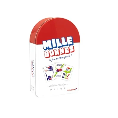 A MUST-HAVE GAME: Discover or rediscover the famous game of Mille Bornes in a prestige version! A metal box and the iconic Mille Bornes cards with the graphics of 1954! A TRANSGENERATIONAL & FAMILY GAME: In this anniversary edition, play with the iconic cards that have marked generations! The product: A neat finish for a prestige edition not to be missed and quality cards with the emblematic graphics of the Mille Bornes! Contents: 110 cards including 4 memo cards, 1 shoe, 4 tokens, 1 game rule, 1 memento, Manufacturer: Jumbo group