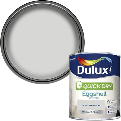 General description This Dulux Quick Dry Eggshell Paint in Polished Pebble is perfect for achieving a contemporary look in your home. It is designed for interior use and provides a self-undercoating finish. Technical specifications Size: 750 ml Effect and finish: Matt Suitable surfaces: Walls and ceilings Coats recommended: 2 Coverage: 5L covers 80 sq m Compatibility and accessories For exterior use: No For use in kitchens and bathrooms: No