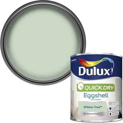 General description This Dulux Quick Dry Eggshell Paint in Willow Tree is perfect for achieving a contemporary look in your home. It offers a self-undercoating feature, making application easier. Technical specifications Size: 750 ml Effect and finish: Matt Suitable surfaces: Walls and ceilings Coats recommended: 2 Coverage: 5L covers 80 sq m Compatibility and accessories For exterior use: No For interior use: Yes For use in kitchens and bathrooms: No