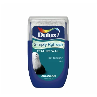 General description Dulux Simply Refresh Feature Wall Tester Pot in Teal Tension is a convenient 30ml tester pack designed for easy application with a built-in roller. This product allows you to explore a wide range of colors to enhance your living space. The compact size is perfect for delivery, fitting through your letterbox.