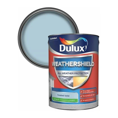General description Dulux Weathershield All Weather Protection Smooth Masonry Paint is an exterior wall paint formulated with unique Stay Clean technology, which protects against dirt and mould growth within the paint film, ensuring long-lasting colour and finish. This high-performance paint is designed to withstand all weather conditions for up to 15 years. Technical specifications Volume: 5L Coverage: Up to 15m²/litre Drying Time: 4 hours Coats: 2 Installation Ensure the wall is dry before paint application. Apply 2 coats using a suitable brush or roller. Leave 4 hours between coats. Do not use on common or Fletton bricks. Apply only in dry conditions, above 10°C, and when bad weather is not forecast. Usage For best results, mix multiple cans together in a larger container or finish in a corner before starting a new can. Other information Weathershield Promise: If your walls peel, flake, or there is mould growth within the paint film while you live in your home, Dulux will return