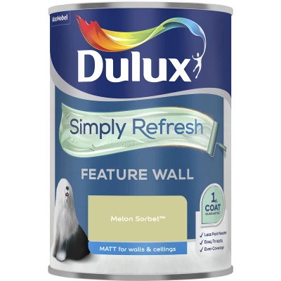 General description Dulux Simply Refresh Feature Wall Matt Emulsion Paint is designed to easily create a focal point in any room. This paint has been specifically formulated to provide a perfect finish in just one coat, ensuring efficiency and a beautiful result. Technical specifications Finish: Matt Coverage: 10m² per litre Drying Time: 4 hours Coats Required: 1 Volume: 1.25L Installation Apply a thick, even coat using a brush for edging. Use a medium pile roller to cover larger surfaces. Load the roller evenly and generously, ensuring paint is not spread across more than 0.5m² per roller load for optimal application. If areas are missed, touch up with paint from the same can instead of overcoating the entire area. Allow a minimum of 4 hours before touching up. Usage Ideal for creating a feature wall in any room. Designed for quick application with less paint compared to traditional two-coat methods. Ensure proper application to avoid the need for a second coat, especially with