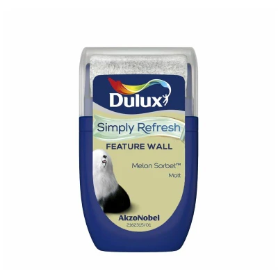 General description Dulux Simply Refresh Feature Wall Tester Pot in Melon Sorbet is a convenient 30ml tester pack designed for easy application. It comes with a built-in roller, making it simple to add a splash of color to your walls. This ideal size fits through your letterbox, allowing for hassle-free delivery.