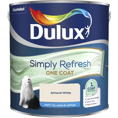 General description Dulux Simply Refresh One Coat Matt Emulsion Paint is specially formulated to provide a perfect finish in just one coat. Its extra thick formulation allows for a quicker refresh of your home with less paint compared to traditional two-coat applications. Technical specifications Finish: Matt Coverage: Up to 10m² per litre Drying Time: 4 hours Coats Required: 1 Installation Apply a thick, even coat using a brush for edging, followed by a medium pile roller for larger areas. Load the roller evenly and generously, ensuring not to spread paint over more than 0.5m² per roller load for optimal application. If areas are missed, touch up with paint from the same can instead of overcoating the entire area. Leave a minimum of 4 hours before touching up. Usage Prepare surfaces by removing loose or flaking material and ensuring they are clean and dry. For new, bare, and absorbent surfaces, seal with Dulux Sealer for Plaster. Repair damaged walls using appropriate Polycell