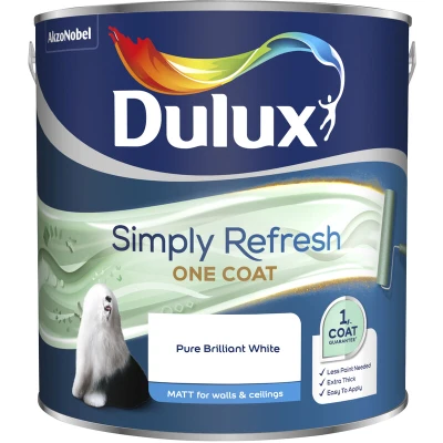 General description Dulux Simply Refresh One Coat has been specifically formulated to easily give you the perfect finish in just one coat. Its extra thick formulation means you only need one coat to refresh your home in a fraction of the time and with less paint. When Pure Brilliant White is used over dark colours, an additional coat may be required to achieve the desired finish. Technical specifications Finish: Matt Coverage: 10m² per litre Drying Time: Minimum 4 hours Installation Apply a thick, even coat using a brush for the edging first. Use a medium pile roller to cover larger surfaces. Load roller evenly and generously, ensuring paint is not spread across more than 0.5m² per roller load to achieve the One Coat application. If areas have been missed during application, touch up with paint from the same can rather than overcoating the whole area. Leave a minimum of 4 hours before touch up. Usage Failure to apply correctly may result in a second coat being required, particularly