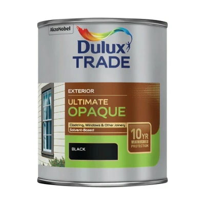 General description Dulux Trade Ultimate Opaque is a high-performance solvent-based exterior coating that delivers a water-repellent satin finish. This product combines a solid color with the advantages of a premium quality wood stain, ensuring that exterior joinery is protected from extreme weather for up to 10 years when applied according to instructions. It is suitable for both hardwoods and softwoods. Technical specifications Finish: Matt Coverage: Up to 20m² per litre Drying Time: 4-6 hours Recoatable: 16 hours Composition: Solvent-based Installation Stir thoroughly before use. For bare wood, ensure suitable preparation and priming with the appropriate basecoat. Apply 2 or 3 coats of Dulux Trade Ultimate Opaque using a brush or roller only; spray application is not recommended for health and safety reasons.