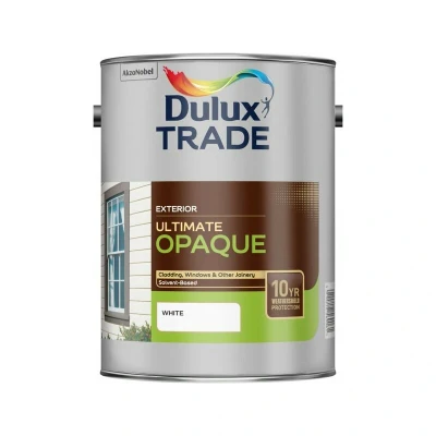 General description Dulux Trade Ultimate Opaque is a high-performance solvent-based exterior coating that provides a water-repellent satin finish. This product combines a solid color with the advantages of a premium quality woodstain, ensuring that exterior joinery is protected from extreme weather for up to 10 years when used according to instructions. It is suitable for both hardwoods and softwoods. Technical specifications Finish: Matt Coverage: Up to 20m² per litre Drying Time: 4-6 hours Recoatable: 16 hours Composition: Solvent-based Installation Stir thoroughly before use. For bare wood, ensure suitable preparation and priming with the appropriate basecoat. Apply 2 or 3 coats of Dulux Trade Ultimate Opaque using a brush or roller only; spray application is not recommended for health and safety reasons.