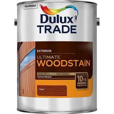 General description Dulux Trade Ultimate Woodstain is a high-performance solvent-based exterior woodstain that provides a water-repellent satin finish. With its unique Ultimate wood protection technology, it protects exterior joinery from extreme weather for up to 10 years when applied according to instructions, ensuring that surfaces look better for longer. This product is suitable for both hardwoods and softwoods. Technical specifications Type: Solvent-Based Coverage: Up to 20m² per litre Touch Dry: 4-6 hours Recoatable: 16 hours Application Method: By Brush or Roller only Installation Stir thoroughly before use Do not thin Apply 2 or 3 coats for optimal protection