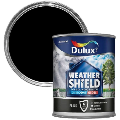 General description Weathershield One Coat Gloss from Dulux provides a stunning high gloss finish while ensuring 6 years of weather protection for exterior wood and metal surfaces. Technical specifications Available sizes: 750ml and 2.5 Litres Colour: Black Coverage: 12 m²/L Usage Apply just one coat to cleaned, primed surfaces in good condition. The paint film is mould resistant to minimize staining and flexible to resist cracking.