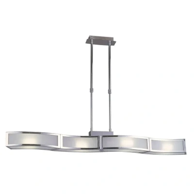 The Duna Linear Pendant with four lights makes a bold statement in polished chrome and white acrylic. Its sleek design adds a modern touch, making it an ideal choice for a dining area or kitchen.
