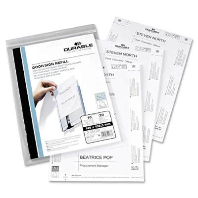 Computer-inscribable insertable signs for Durable door sign Info Sign Art 4800 and Click Sign Art 4860 10 paper sheets à 50 labels; with micro-perforation for easy detachment Door sign inserts for professional lettering with free online software Duraprint Print sheets suitable for all common laser and inkjet printers or copiers Cardboard signs Door Sign Refill, dimensions: 149 x 52,5 mm (W x H) Suitable for all information signs size 149 x 52.5 mm. Inserts can be printed using the Information Sign Software available from http://www.durable-uk.com/gb/products/duraprint/index. Pack contains 10 sheets (50 inserts).