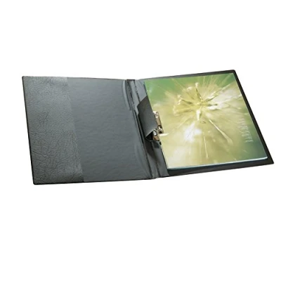 Article description: Clamping lever folder Description of the special features: With lever mechanism, inner pocket in front lid Material of the clamp: Metal Colour of the clamps: Black Material: plastic