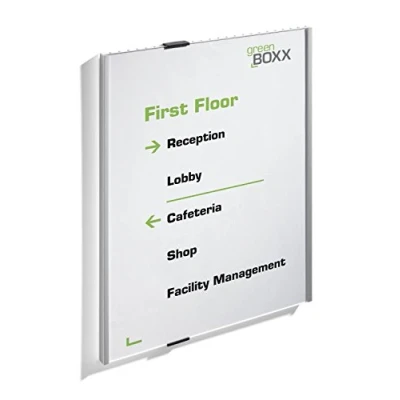 HIGH-QUALITY: The sign is made from a stable aluminium frame withan acrylic face place and an exchangeable cardboard inlay FIXINGS INCLUDED: The sign includes a mounting kit as well as drilling template and instructions for easy installation FREE DESIGN SOFTWARE: Templaces and be designed and downloaded for free from the Durable Website via our free to use DURAPRINT software AREAS OF APPLICATION: Perfect for clearly identifying rooms and locations in places such as offices, hotels, public buildings, retail, etc, DIMENSIONS: The sign measures 297x420mm (A3 Portrait) to provide you with a clear and easy to read signage solution
