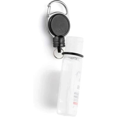 Retractable reel with a special holder for small hand sanitiser / disinfectant travel bottles, suitable for common hand gel bottles O-ring Ø 20 mm ensures a secure hold of the bottle neck, metal clip can be attached to smock, trouser loop, rucksack etc Extra strong reel with reinforced band, length: 60 cm Magnet holds reel rolled up to a weight of max. 300 g (approx. 250 ml bottle) Comes as a pack of 1 piece in the colour black - Environmentally friendly in accordance with ISO 14021: min. 95 Percent recyclable