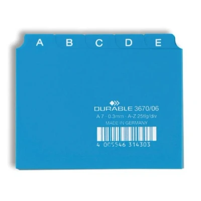 HIGH-QUALITY: The index cards are made of strong PVC making them extremely rigid and durable and allows them to be used time and time again ANTI-GLARE: The tabs are anti-glare and clear with replaceable card inserts for easy organisation EASY ORGANISATION: The index cards includes A-Z tabs which make it quick and easy to organise important documents, business cards, etc. LEADING BRAND: Durable is one of the leading German brand companies in the field of office organisation and presentation materials PACK SIZE & DIMENSIONS: The index organiser cards come as a pack of 1 set of 25 dividers in A7 format. Dimensions: 74 x 105mm - Thickness: 0.3mm - Tab Width: 20mm