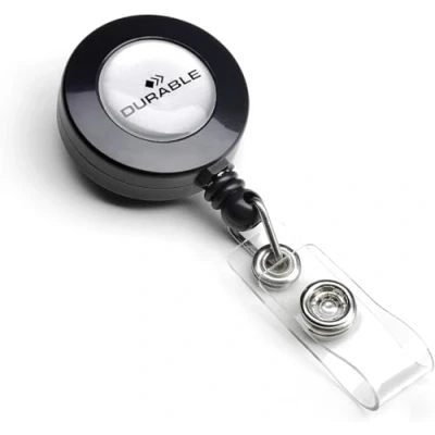 STYLISH: Stylish badge reel with fastener in charcoal colour for use with all DURABLE name badges with punched holes for a clip EASY ATTACHMENT: The badge reel has a clip on the back so that you can easily attach to various clothing without causing damage to the material MADE IN GERMANY: Durable is one of the leading German brand manufacturers of office organisation and presentation equipment AREAS OF APPLICATION: This badge reel is perfect for identification badges, key fobs or security passes which must be worn at all times LARGE CORD: The badge reel has a strong and robust cord which can extend to 850mm making it perfect for use with access cards and key fobes, etc,
