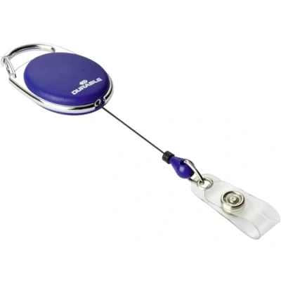 STYLISH: Stylish badge reel with fastener in blue colour with metal plated finish for use with all DURABLE name badges with punched holes for a clip EASY ATTACHMENT: The badge reel style has a clip attachment option at the top to easily hook onto clothing MADE IN GERMANY: Durable is one of the leading German brand manufacturers of office organisation and presentation equipment AREAS OF APPLICATION: This badge reel is perfect for identification badges, key fobs or security passes which must be worn at all times LARGE CORD: The badge reel has a strong and robust cord which can extend to 850mm making it perfect for use with access cards and key fobes, etc,